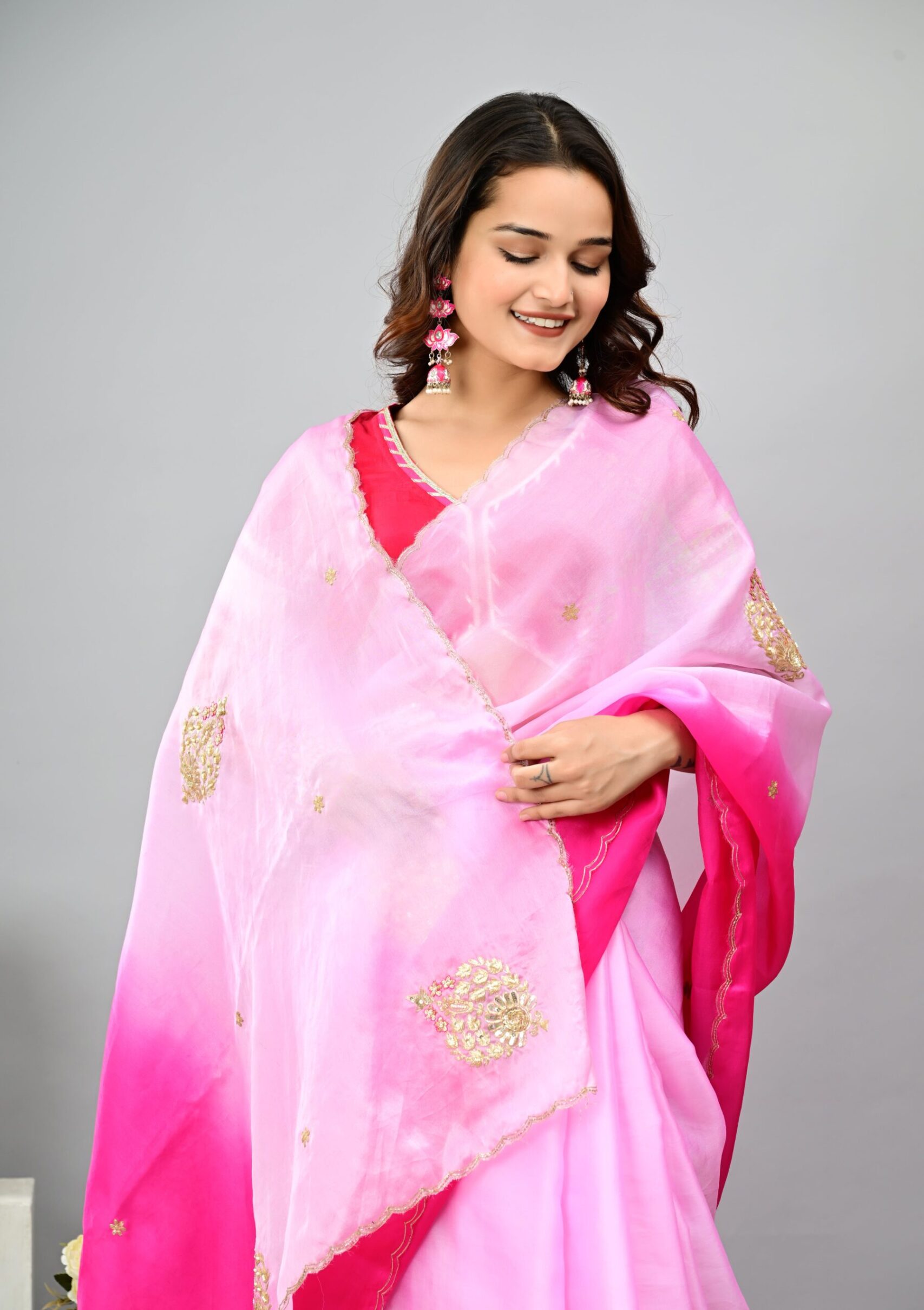 This Pink Handwork Ombre Dye Saree is a timeless blend of luxury and tradition. Made with lightweight organza, it drapes like a dream, offering grace with every movement. The subtle ombre tones create a soft gradient that flatters all skin tones, while the delicate hand embroidery adds a touch of glamour.